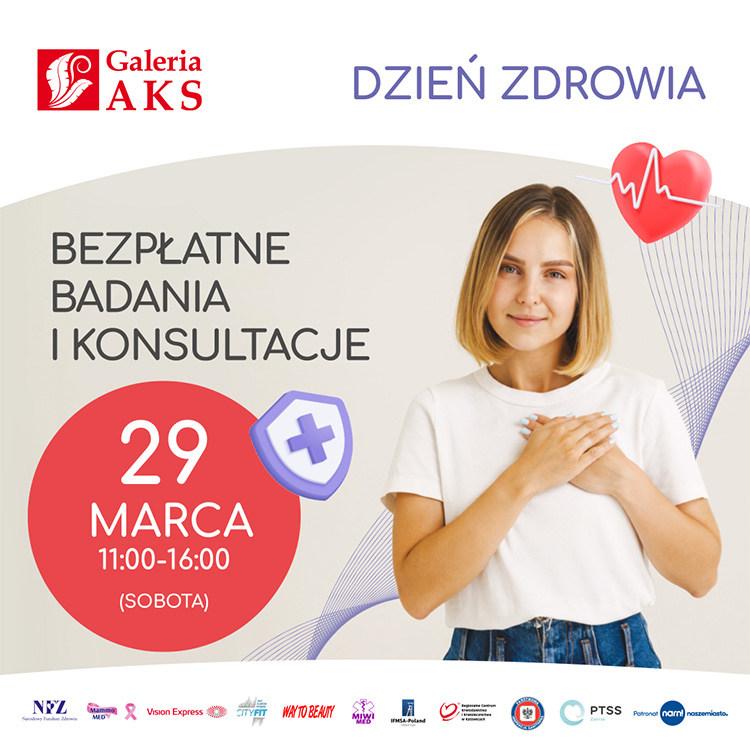 Tuż przed Światowym Dniem Zdrowia Galeria AKS zaprosi na szereg bezpłatnych badań i konsultacji związanych z profilaktyką i zdrowym stylem życia. W godzinach 11.00 – 16.00 w centrum dostępne będą stanowiska: